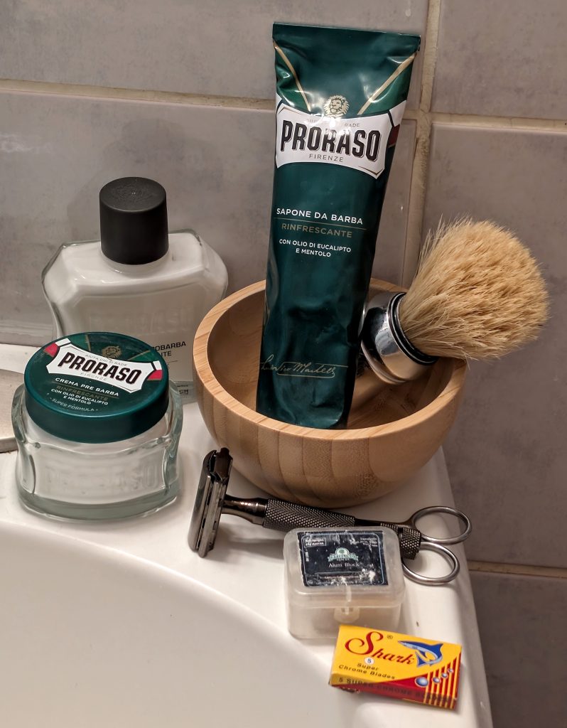 - Pre-Shave: Proraso Refreshing pre-shave cream (green)