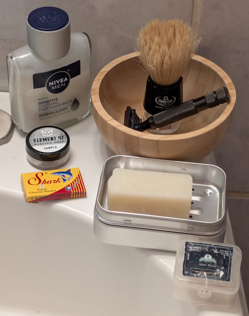 There was almost sting with the alum, and even with some extra strokes to get about as close as I could, it didn’t compound any discomfort. While I’m not a huge fan of the Stirling pre-shave soap, it worked well enough with the Element 47 soap to make for a nicely slick and protective lather. And the Nivea balm as always did a great job of helping to heal and moisturize after the shave.