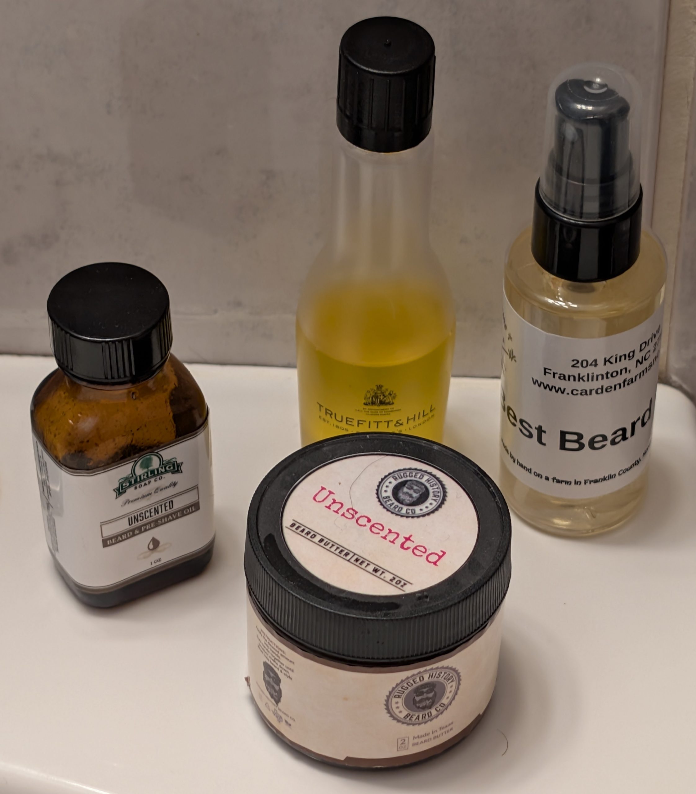 My Beard Products: (L to R) Stirling Soap Co. Unscented pre-shave & beard oil, (rear) Truefitt & Hill pre-shave oil, (front) Rugged History Beard Co. unscented beard butter, Carden Farms best beard oil.