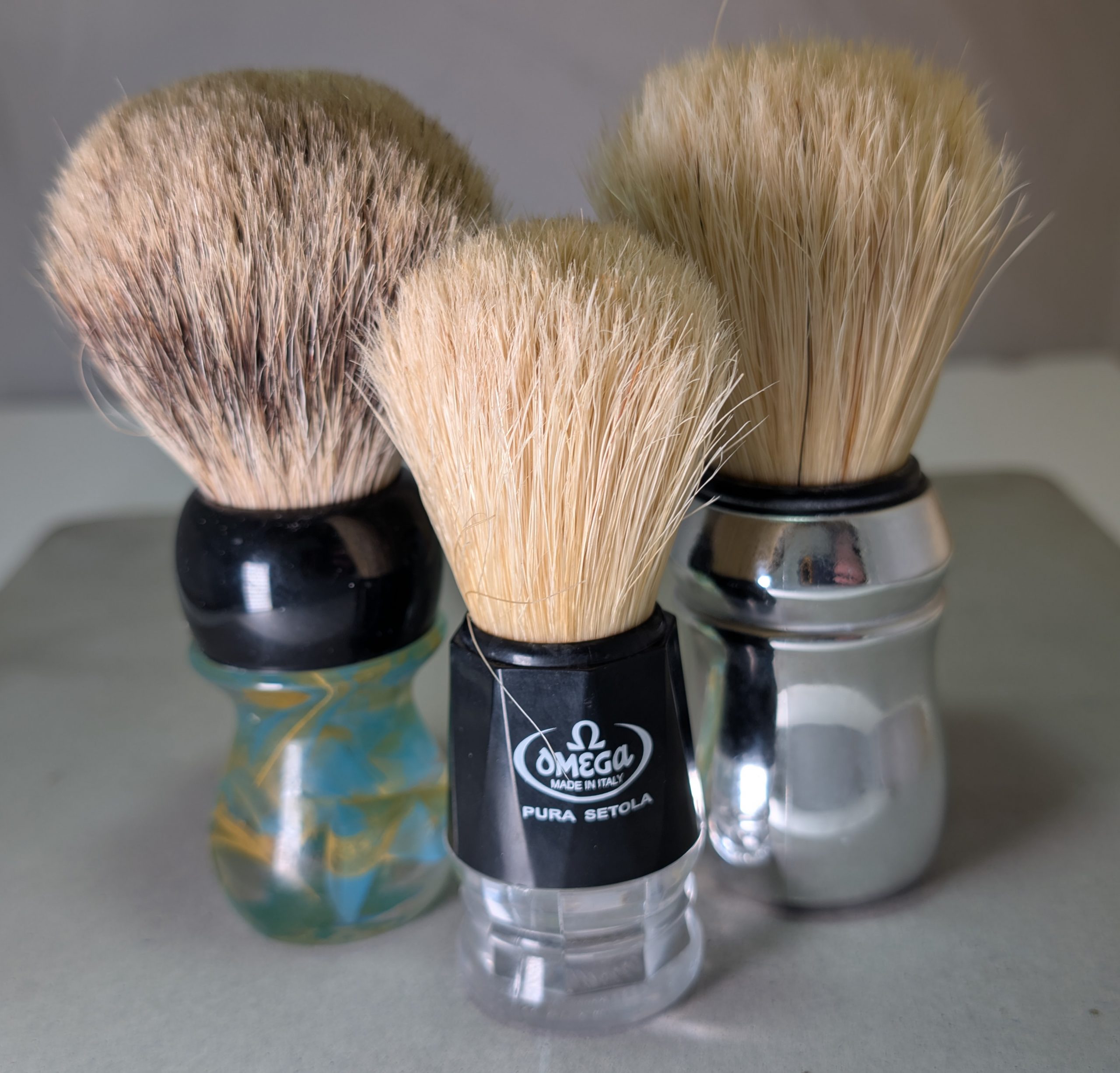 In the picture above, I’m showing off my current three brushes, from left to right, a Razor Emporium badger shaving brush, an Omega 10019 boar shaving brush, and on the right a Proraso boar shaving brush (also made by Omega).