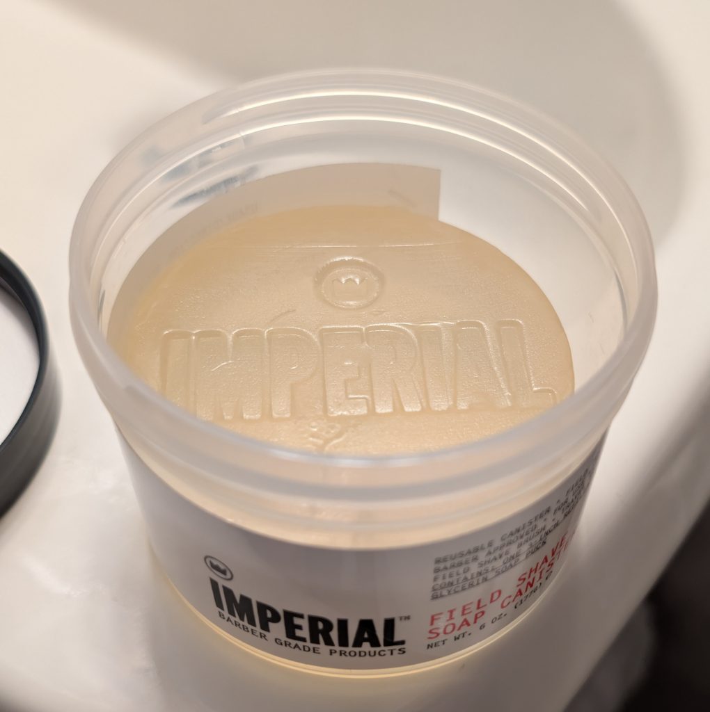 19. Imperial Barber Products Field Shave Soap. Before you read the rest of this review, it should be noted that this really isn’t a bad soap. It’s just that I have so many others before it that I prefer. This was the first glycerin based soap that I’d used, and it was kind of disappointing. It lathers well, but doesn’t seem to lubricate as well as I think it should, given it’s composition. The Henson razors just seem to drag through it, and that doesn’t make for a great shave. It’s fragrance is neutral and soapy, but this one just isn’t great for me. It is a full-sized tub, though, so it’ll be around for quite a while.
