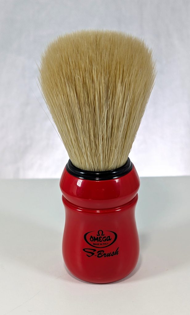 But along that inexpensive vein, I grabbed an Omega S10049–yes, the number closely matches another boar brush I have–but this one has a standard Omega handle design used in the Proraso brush matched to a synthetic boar-like bristle. And it was only $9.