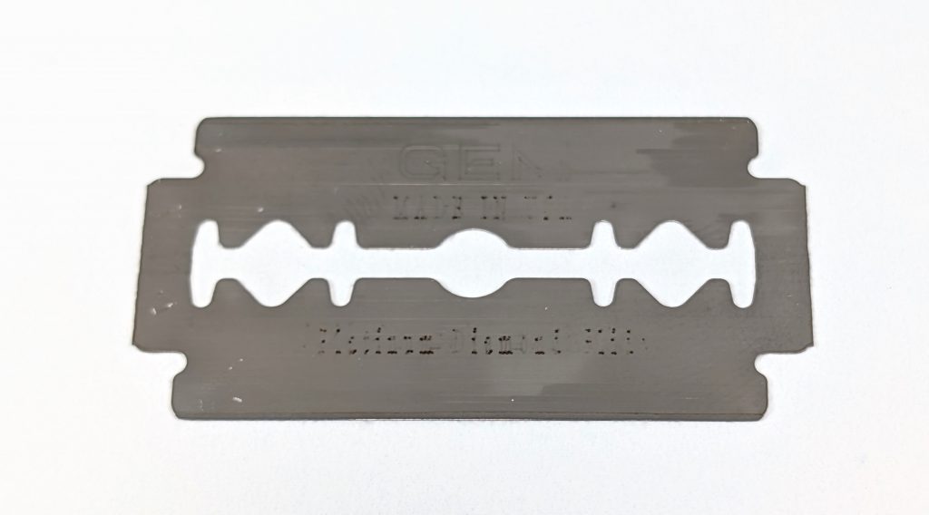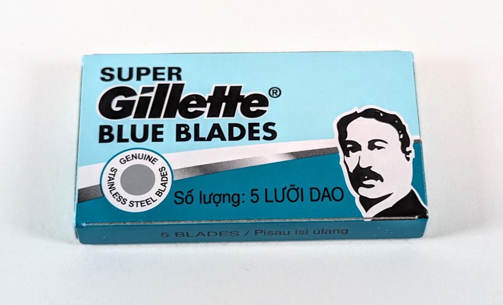 Because I’ve seen them used in a few SOTDs online lately, I grabbed 2 tucks of Super Gillette Blue blades as I’m always down to try a Gillette blade. These are either a reincarnation of the old Gillette Blue blade line, or just a continuation of the existing line that are being imported again–there doesn’t seem to be clear agreement on whether they’re reborn or not. At any rate, the markings are interesting, as they’re made in Shanghai, but clearly have some packaging information written in Thai or Vietnamese. At any rate, I found them intriguing, especially since there’s a pretty active market for new old-stock razor blades (which kind of weirds me out for reasons I can’t define), and the Gillette Blue blades are fairly highly sought after.