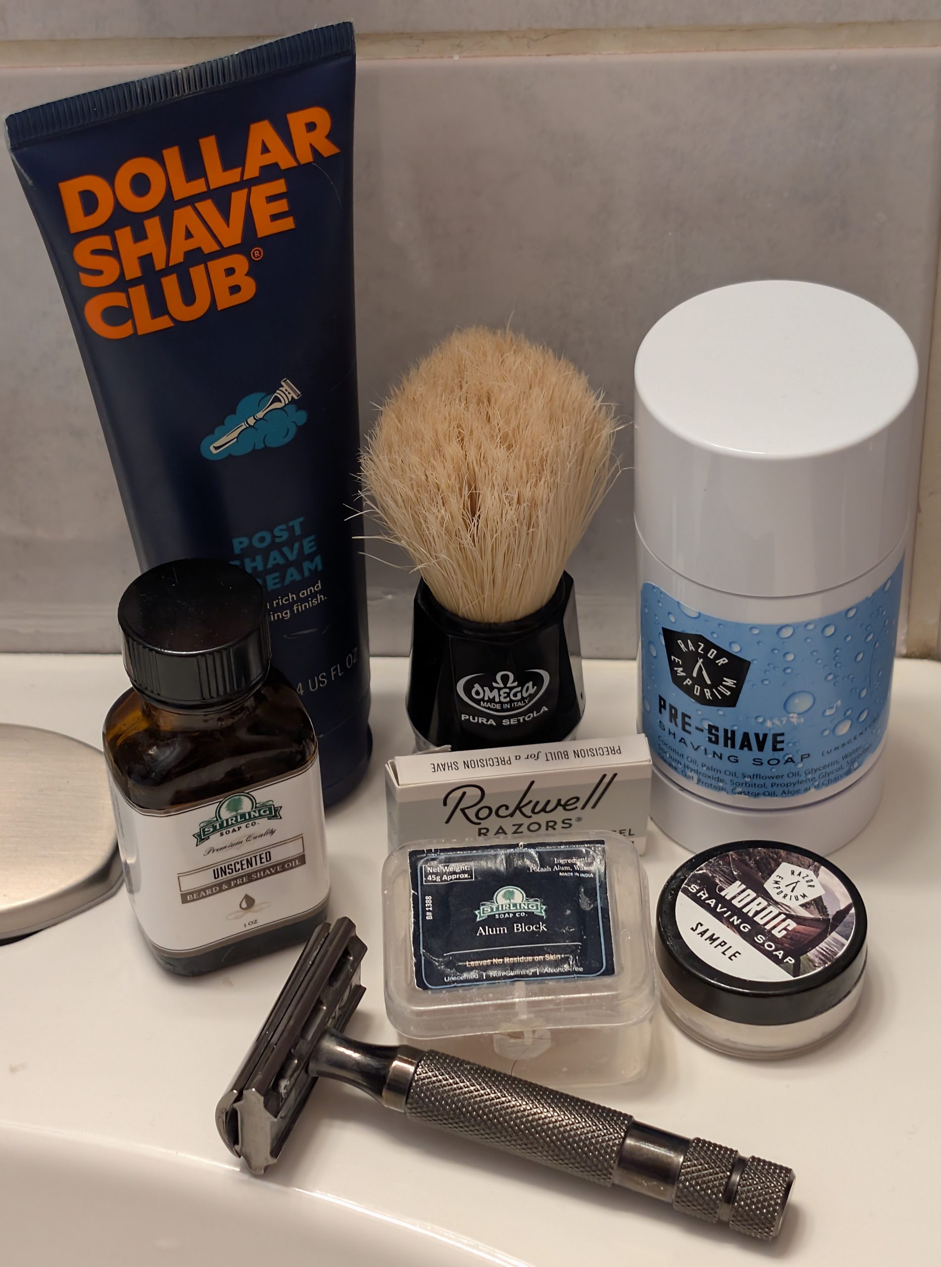 It’s the last shave of the week–Thursday. And this week, I’ve been using the Rockwell 6C razor with the Rockwell blades it came with. (You’ll recall that I’m doing this because I wanted to see how my 3 favorite razors work with the blades their manufacturers paired them with).