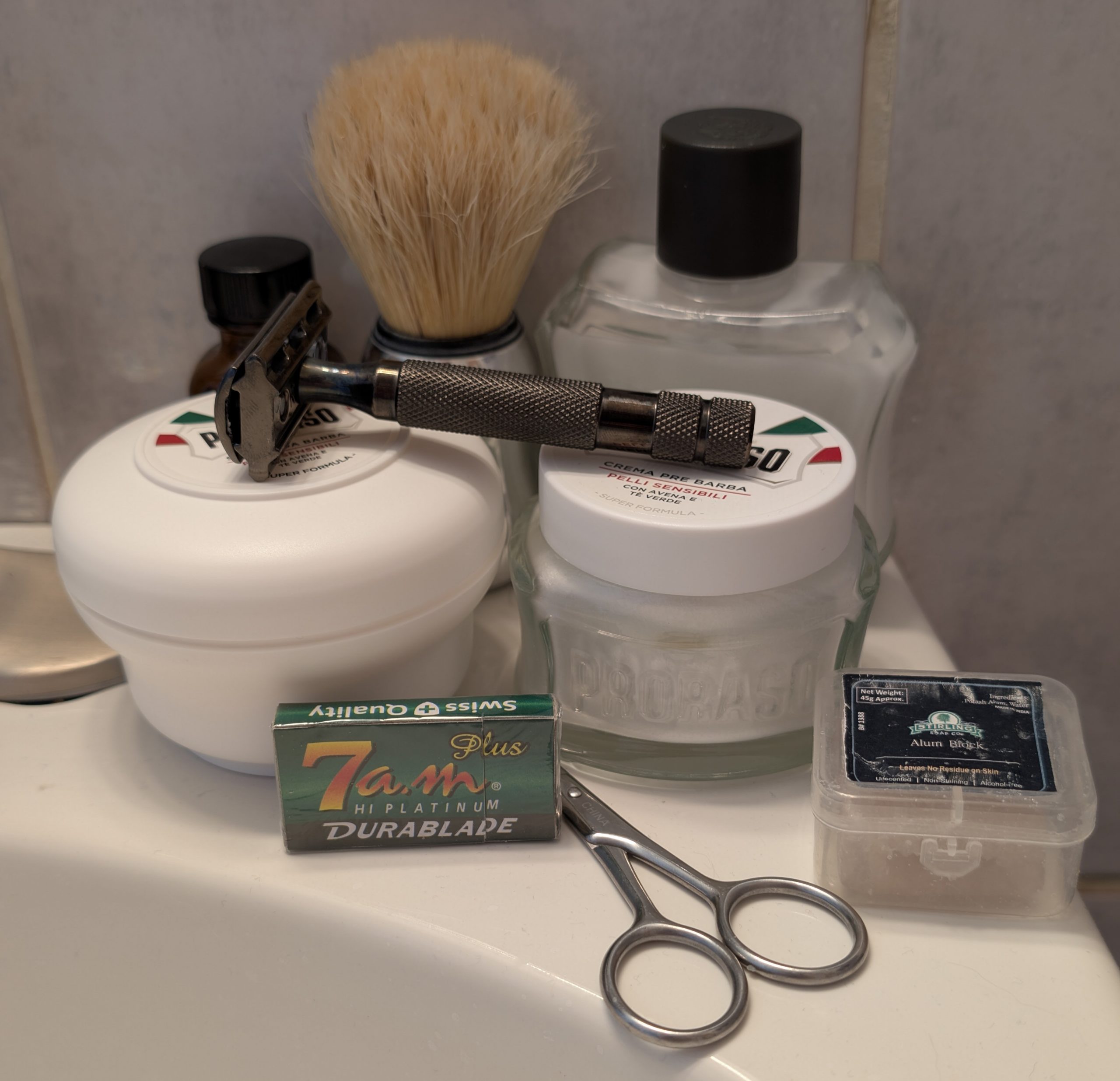 I’m working to get through blades that I have that are new to me. In the last couple of weeks, For the last two months now, I’ve shaved with new to me blades–the Feather, Rockwell, RK, King C Gillette, Bic Chrome Platinum, and Gillette Platinum. And knowing that the Durablade was rated by Razor Emporium as medium aggressive (a 4.0 on a 5 point scale), I decided to pair it with my Rockwell. And for my Sunday shave, I opted to go with the Rockwell’s plate 4–which should be close to a medium or medium-aggressive shave.