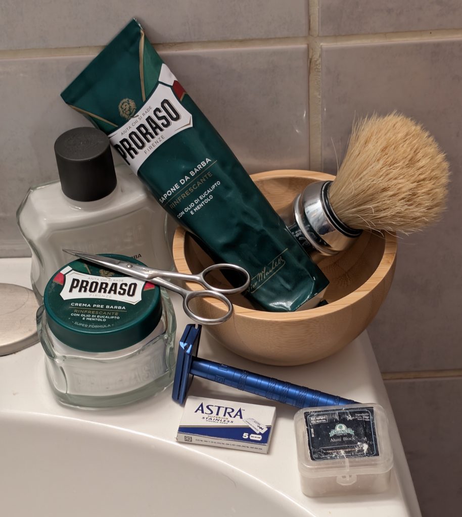 - Pre-Shave: Proraso Refreshing pre-shave cream (green)