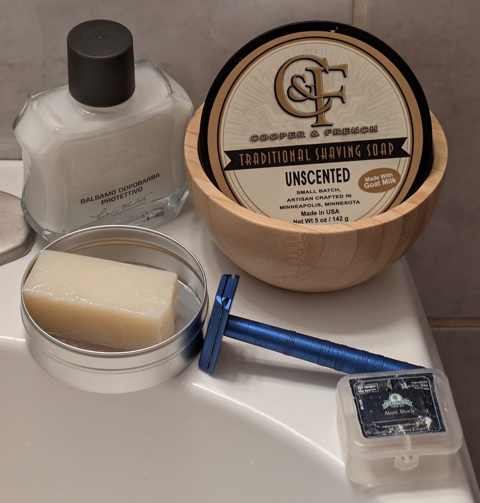 - Soap/Cream/Gel: Cooper & French Unscented shaving soap