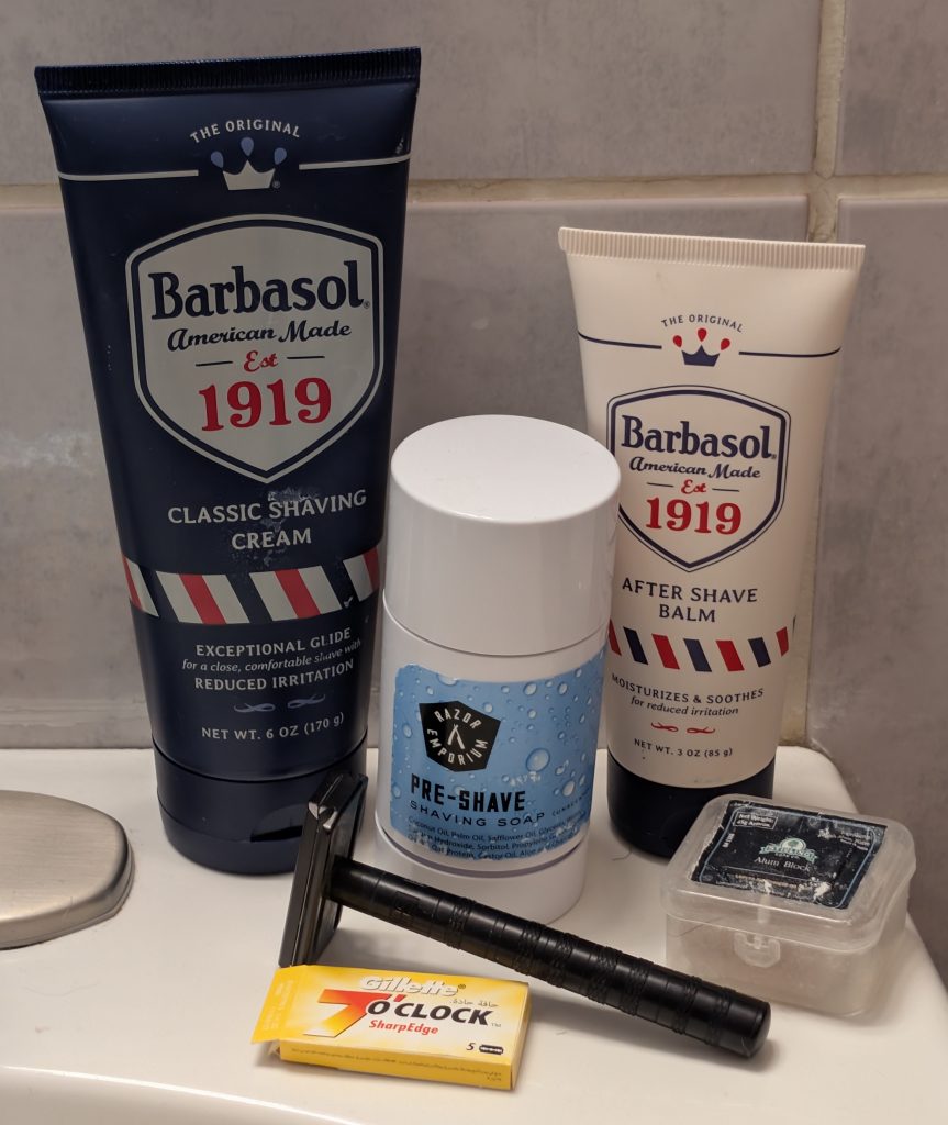 Today’s shave was the perfect shave for today, even though I wasn’t sure it would be. The Barbasol 1919 cream, as I’ve noted before, is thick and slick, but doesn’t lather. It makes for a quicker shave since no bowl and brush are involved, but I wasn’t positive it would be what my face wants right now.