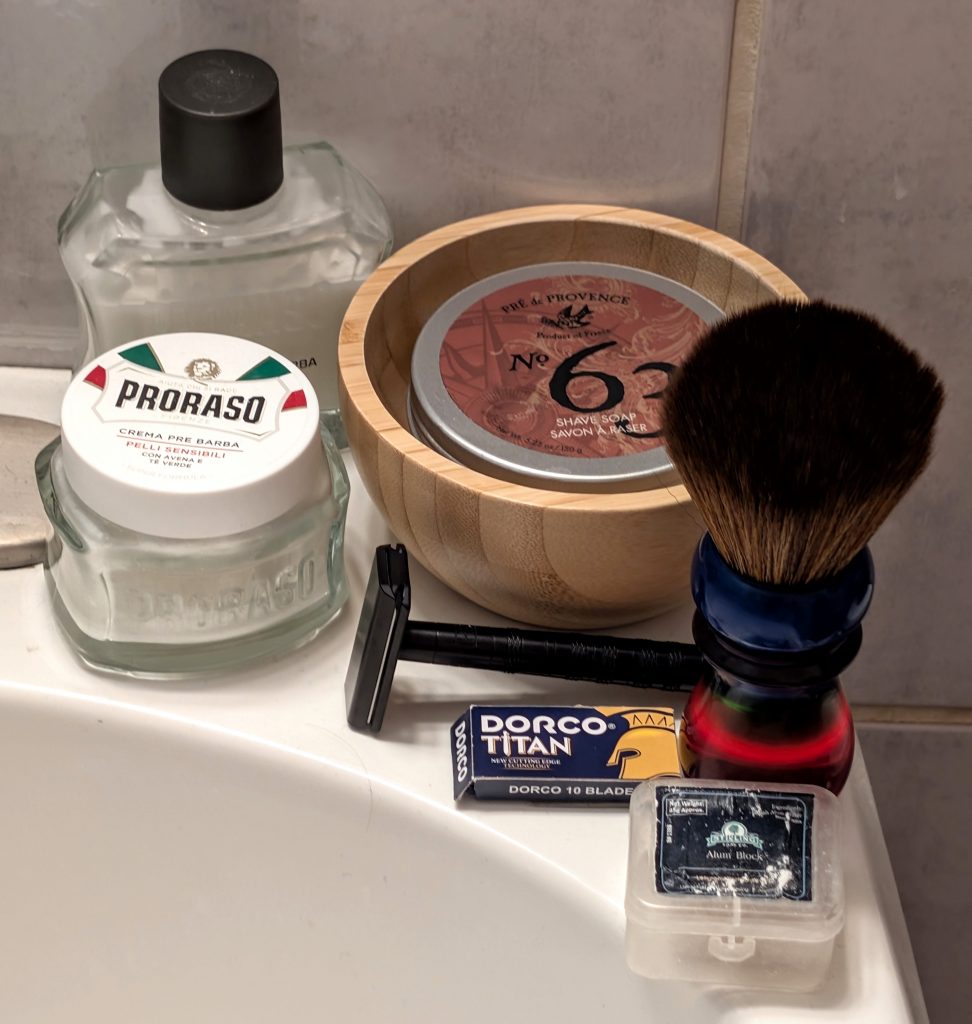 - Soap/Cream/Gel: Proraso Protective shave soap (blue)