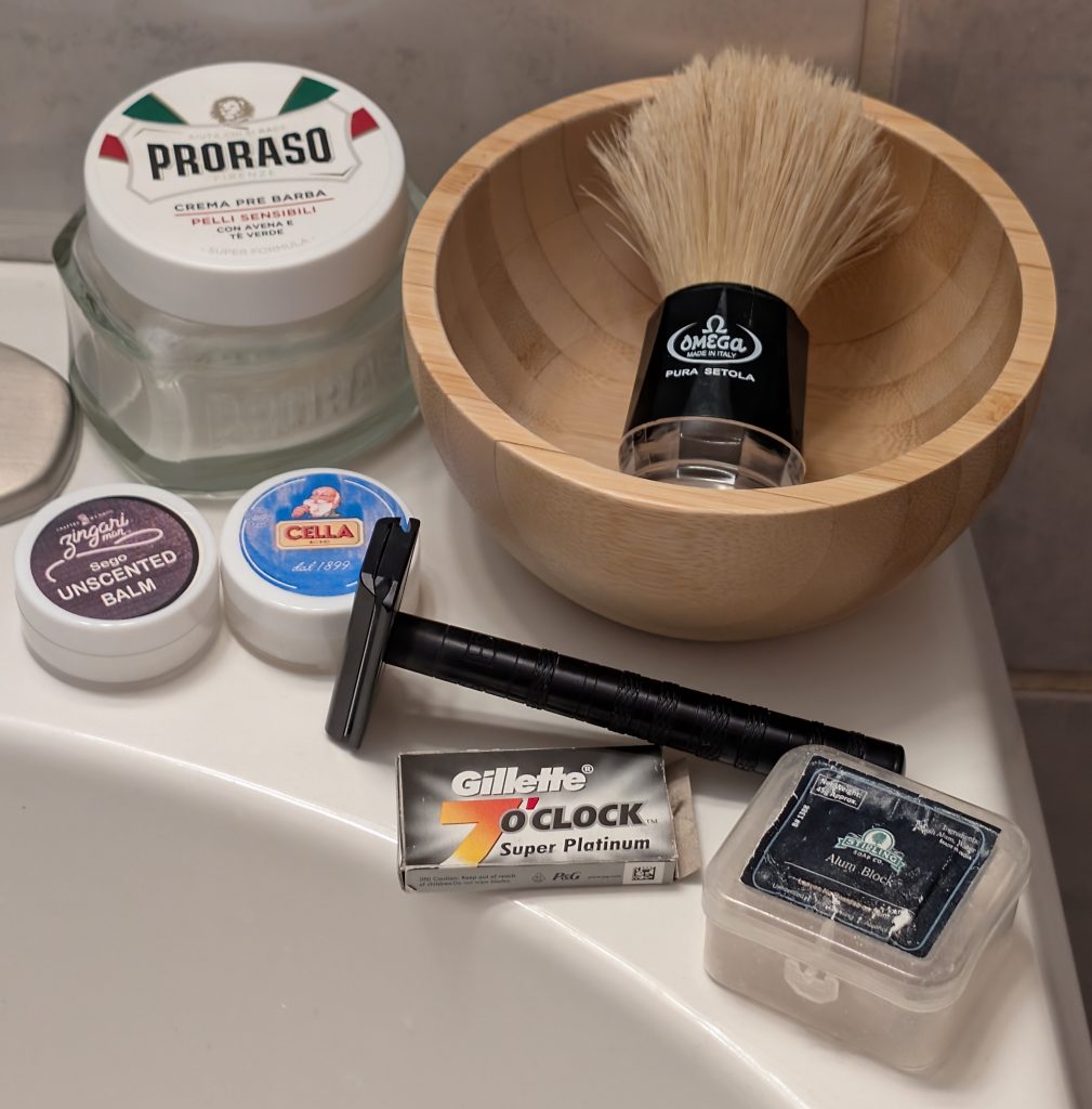 - Pre-Shave: Proraso Refreshing pre-shave cream (green)