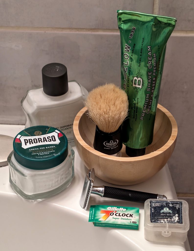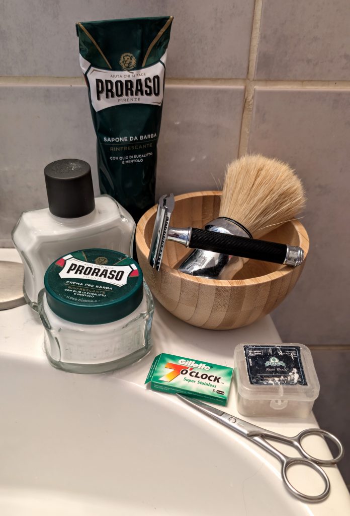 - 13th shave with the Proraso green combo (cream and soap with the pre-shave and aftershave balm)
