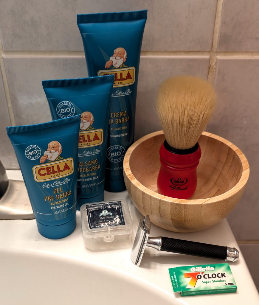 That’s how the plan for the week started. But it’s hard to miss all of the green in this week’s shaves. So I figured I could easily slip in the Cella Organic Aloe Vera (green) line, especially since I also recently picked up their green rapid shaving cream, so I’m getting to two new products in one week while still maintaining my Proraso Sunday.