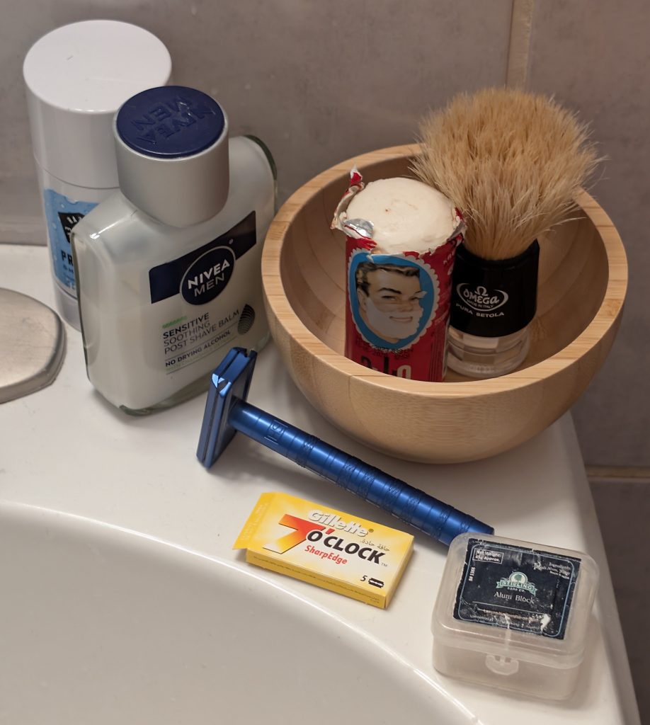 - Blade: Gillette 7 O’Clock Sharp Edge (yellow)