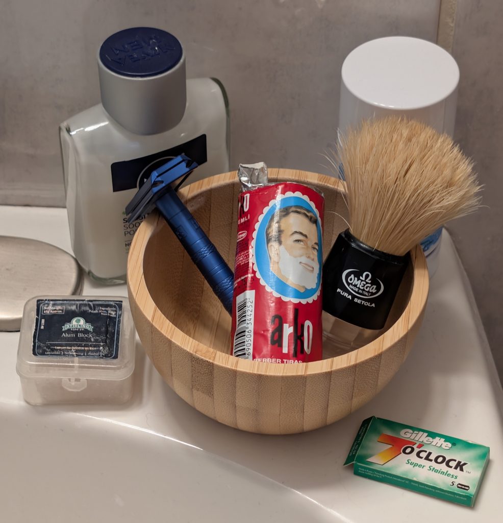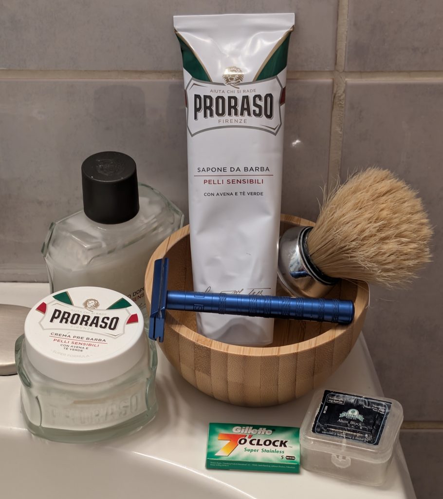- Soap/Cream/Gel: Proraso Sensitive shave soap (white)